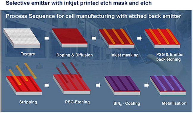 3、Etching back技术,该技术利用腐蚀浆料将非掩膜区域进行刻蚀实现淡扩散区域的制备,具体工艺路线见图5。该图显示了Sch - mid公司如何利用Inkjet技术涂覆石蜡来保护实现金属接触的区域,如何对非接触区域利用化学溶液腐蚀和实现“浅”发射结的制备。据说业内已经有多名厂家在使用该成套设备,而且获得了单晶18.5%左右的效率。
